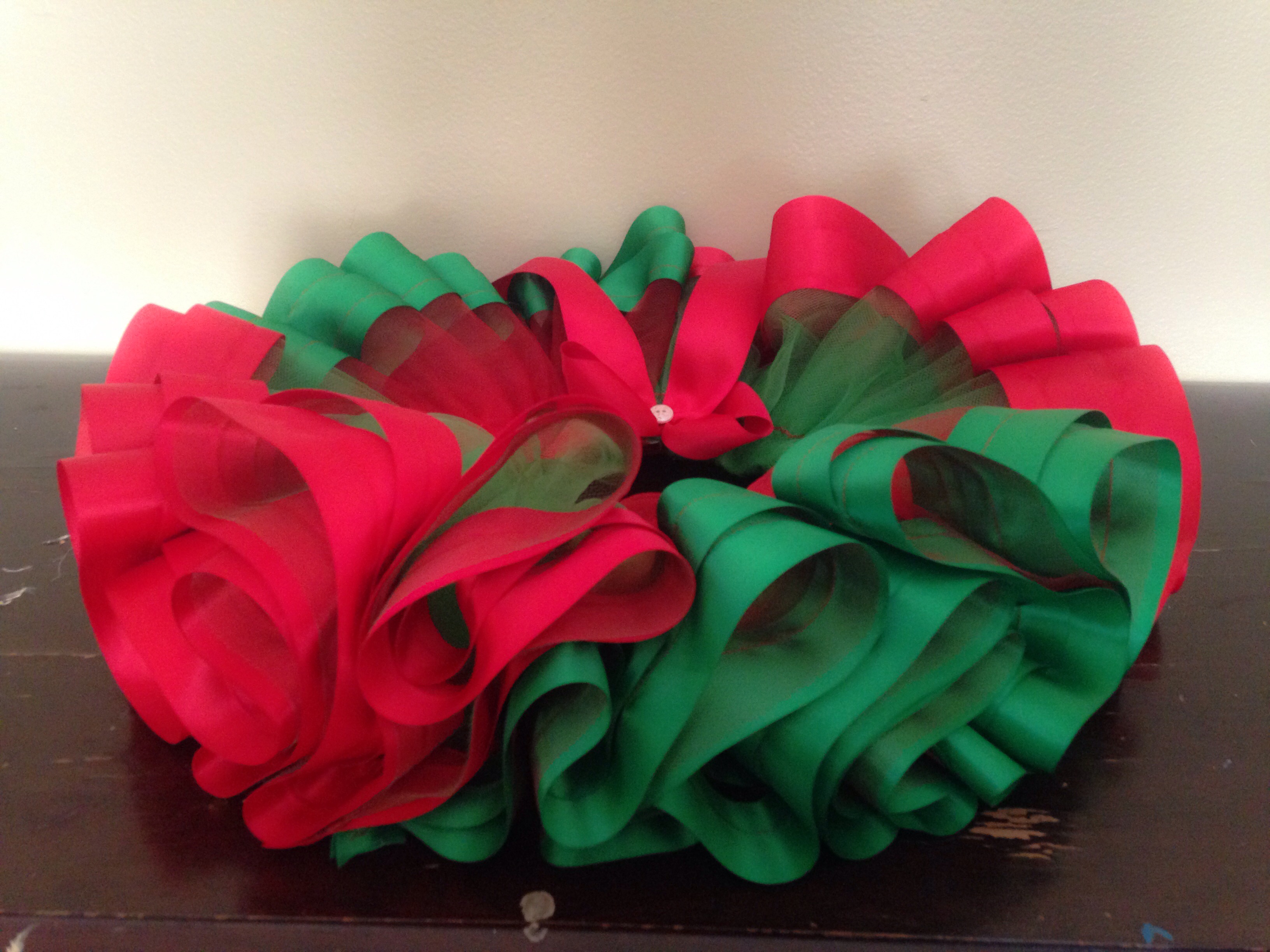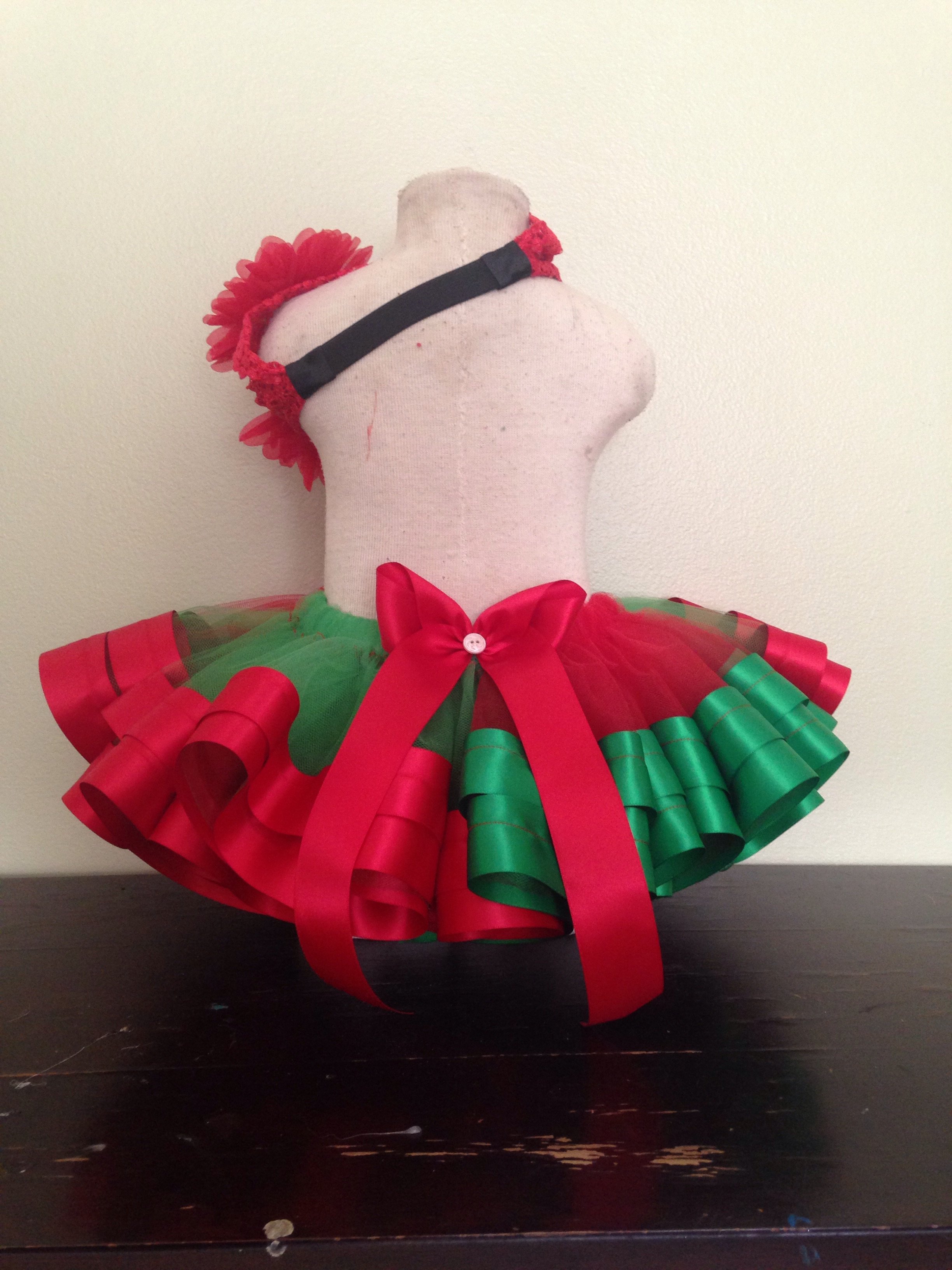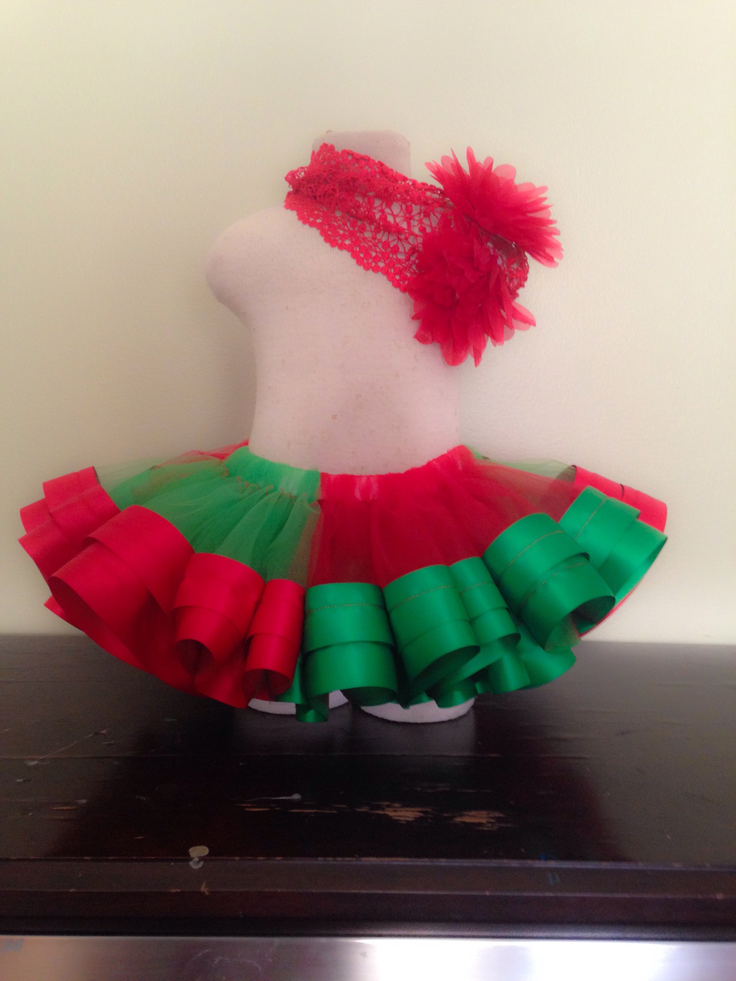 A beautiful sewn ribbon tutu full of ribbon! Red and emerald green tutu adorned with coordinating satin ribbon!