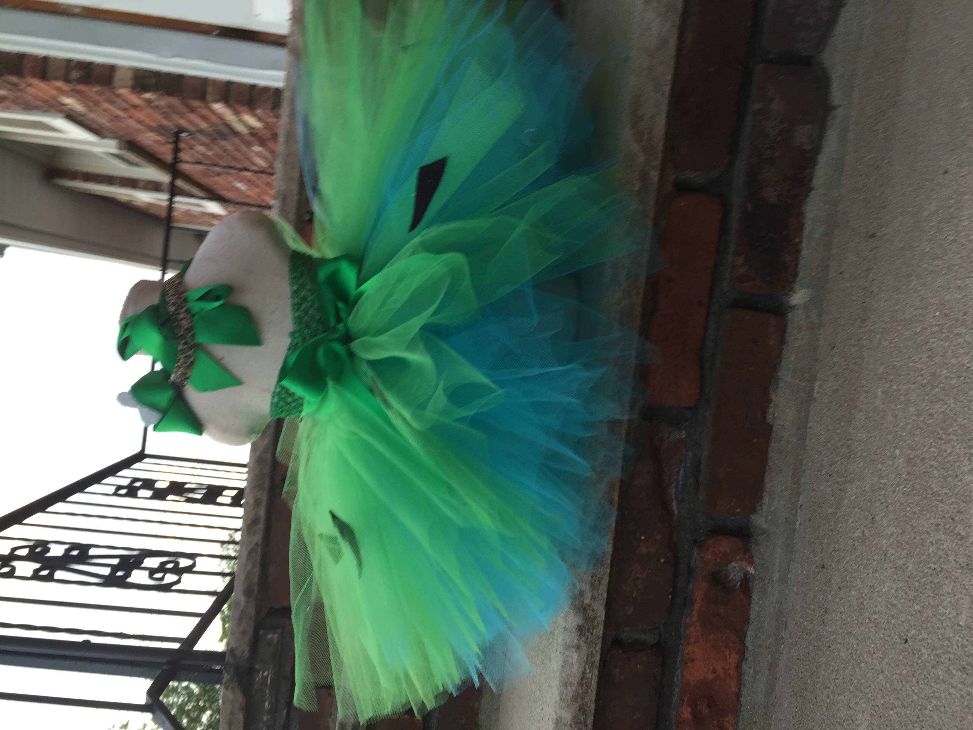 Made on a soft stretchy crochet top. tutu is full!! colors are apple and turquoise tulle!