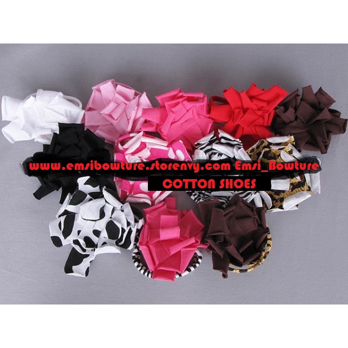 You may be asking yourself what is a baby cotton foot flower? This unique item is new to most of our customers and is a really special and fun way to dress up your baby's feet without having to put a shoe on them. These toe flowers have two soft, stretchy cotton bands that go around the arch of your baby girl's foot and above the heel that allow the flower to sit on the front of her ankle. The cotton flower is made of strips of cotton with unfinished edges that give them a nice curl and the appearance of a flower. Every flower has a soft, faux leather pad on it's back to keep sensitive skin comfortable all day long. These toe flowers come in many different colors and patterns.