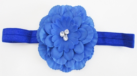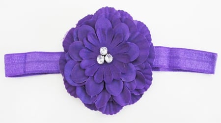 Elastic stretchy headband. 3" flower with 3 tiny rhinestones for center.
