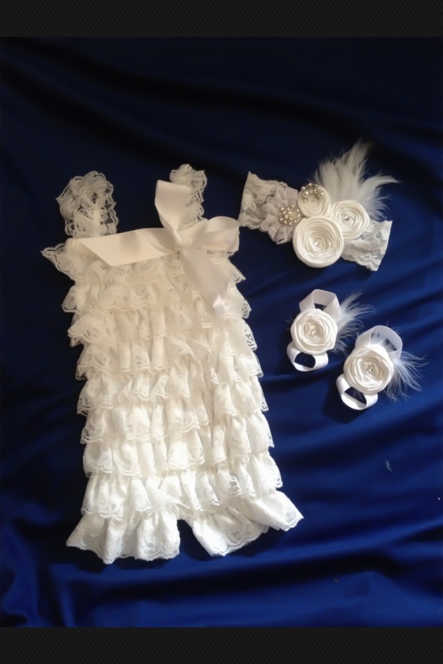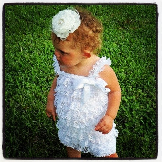 Fabulous white lace romper w handmade vintage chic headband! Vintage style flower shoeless sandals adorned with feathers. This is perfect for newborn pictures, baptism, birthday, weddings and much more!!