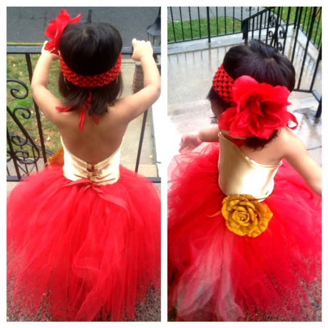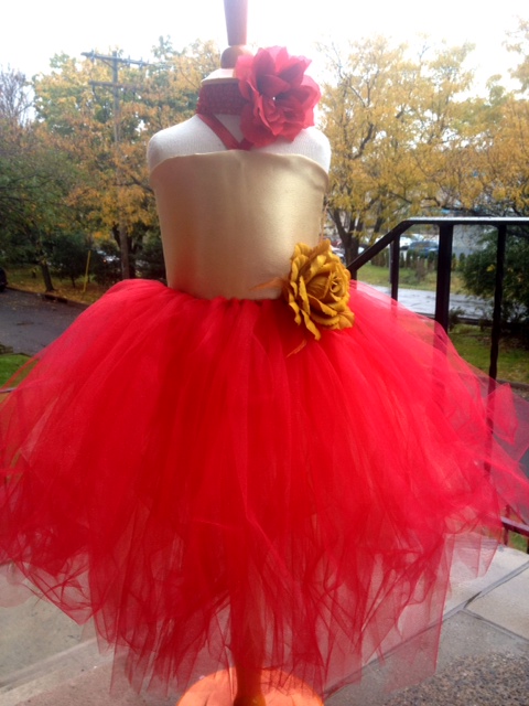 This is made with yards of soft beige and red tulle, accented with gold shimmer!