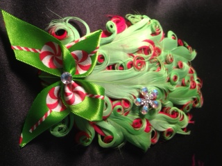 Christmas headband features a beautiful green and red goose feather pad accented with a rhinestone button.